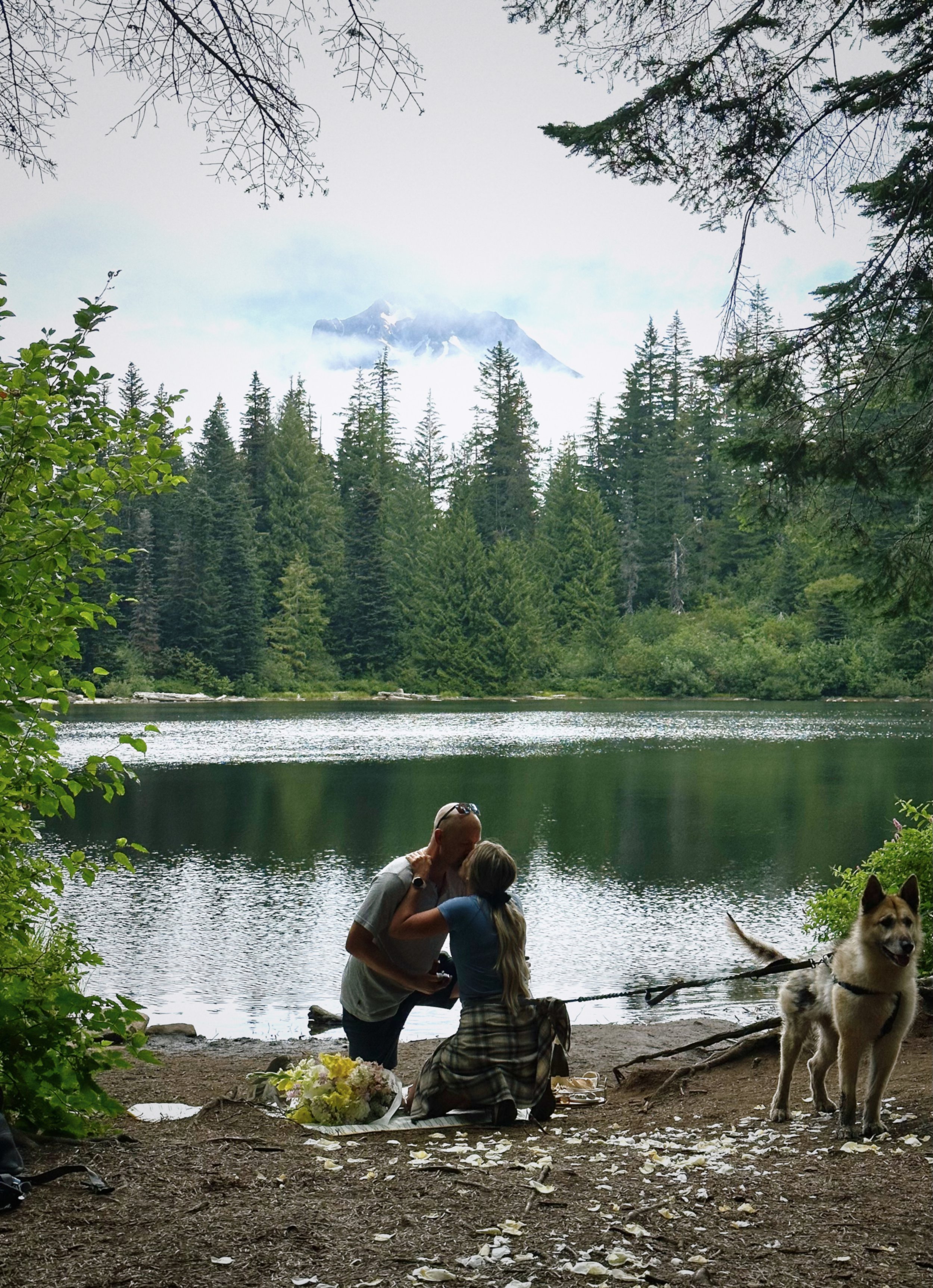 On August 3rd 2025, Hans took Kaylee on a hike near Mount Hood. With her dog Mya leading the way, they climbed to the lookout point at Mirror Pond Lake where Hans dropped to a knee and asked Kaylee to marry him.